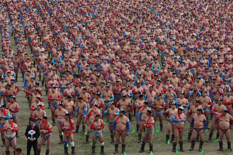 Mongolian wrestling is a full-contact sport played in the outdoor area on the grass during summer, in indoor stadiums during winter. Mongolian wrestling has no classifications based on age or weight, and all wrestlers compete under the same category. The objective of wrestling is to force any part of the opponent’s body except the palm to touch the ground. Mongolian wrestling takes a format of elimination. In Naadam festival, 512 or 1024 wrestlers participate in 9 or 10 rounds of the wrestling competition. Special anniversary years, 1024 wrestlers compete in Naadam. For example, the 800th anniversary of the foundation of the Mongol Empire was 2006.
