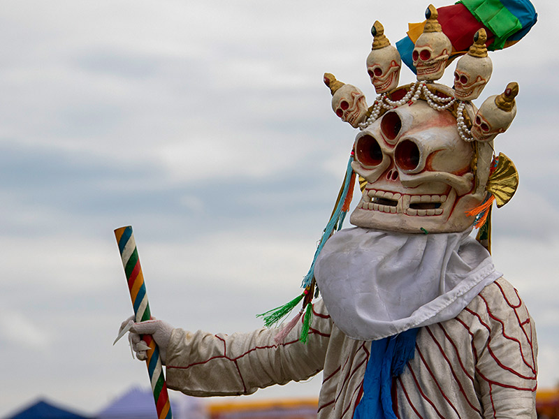 Tsam dance traditionally started with two Sitipati- two figures wearing skull masks and skeleton costumes. They represent Lord of charnel ground.