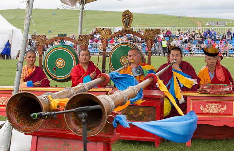 Monks performing Tibet horn and performing spiritual readings and rituals for the wellbeing of Mongolians.