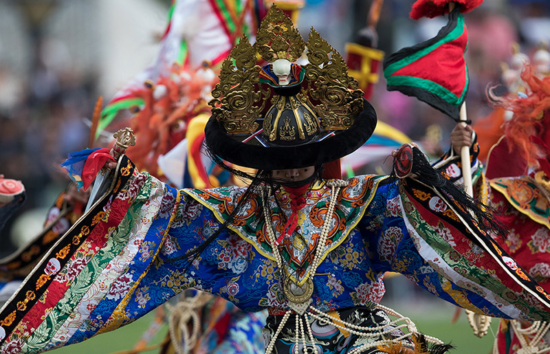 You can see through the photos that the tsam dresses are specially designated with wide triangle sleeves or cave sleeve and also ornamented with bone decorations. Tsam mask is big as twice as a human head and the dancers see their way through their mouth. That’s why tsam masks are made out of paper mache, painted or inlaid with coral beads of different sizes.