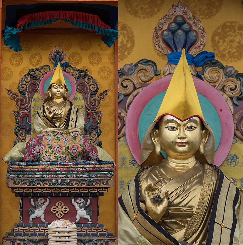 Statue of Under Gegeen Zanabazar holds two attributes -raising the Thunderbolt symbol-Dorje up to his chest with his right hand and bell in his left hand toward his stomach.