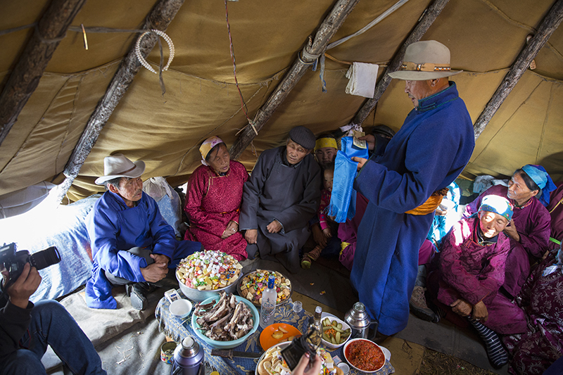 The bride and the groom, their parents and relatives were riding those white horses and heading to the New Teepee / new home/ of the couple. They rounded their teepee three times while they were offered reindeer milk to the spirit of nature earth, kind of shamanic elements and the living tradition of the Mongols. After this ritual, all guests entered the new home, and the hospitality was continued. The oldest man has to touch the main lamb dish on the table and then he offered a small piece of mutton to all visitors.