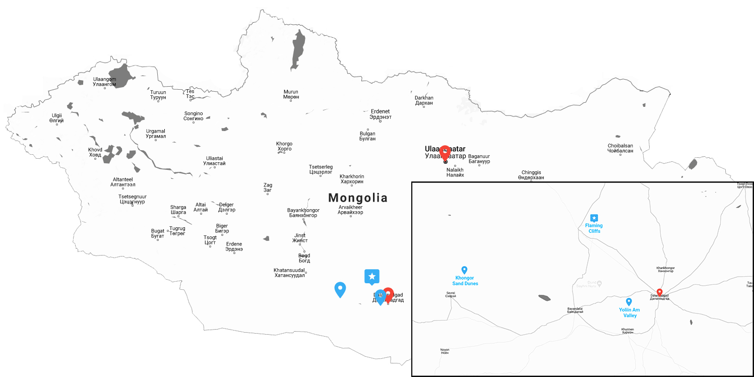 Discover the beauty of Bayanzag (also known as Flaming Cliffs), which was once an ancient sea bed which was existed 60-70 million years ago. This wonderful place is known as the place where a lot of Paleontological findings have been discovered. American explorer Roy Andrew Chapman found dinosaur fossils from Bayanzag and nearby mountain Nemekht during his 2-year expedition throughout the Mongolian Gobi Desert. He discovered 8 different kinds of dinosaurs fossils from Mongolia. You can see dinosaur fossils in the Dinosaur Museum of Mongolia. Chapman’s discoveries made Bayanzag a world-famous place in the field of paleontology. Nowadays, it has become a world-famous touristy place.