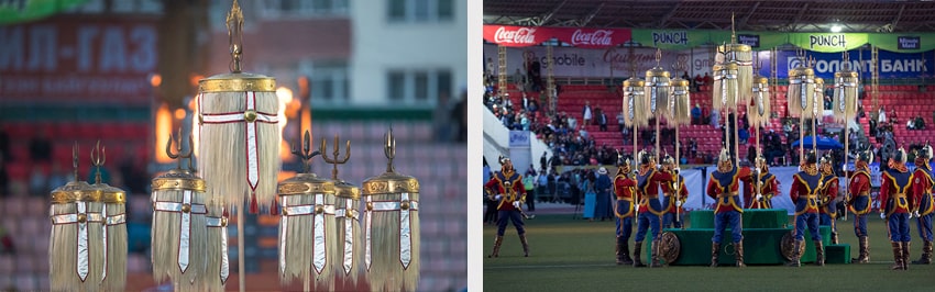9: Nine white banners, which are used as a symbol of the eternal prosperity of the Mongolian state and the people since the foundation of the Mongol Empire, are kept and protected in the Government Palace of Mongolia and only taken out during Naadam Festival and carried as a marker of the beginning of Naadam. Once banners are planted in the main area, the Naadam Festival is allowed to begin.
