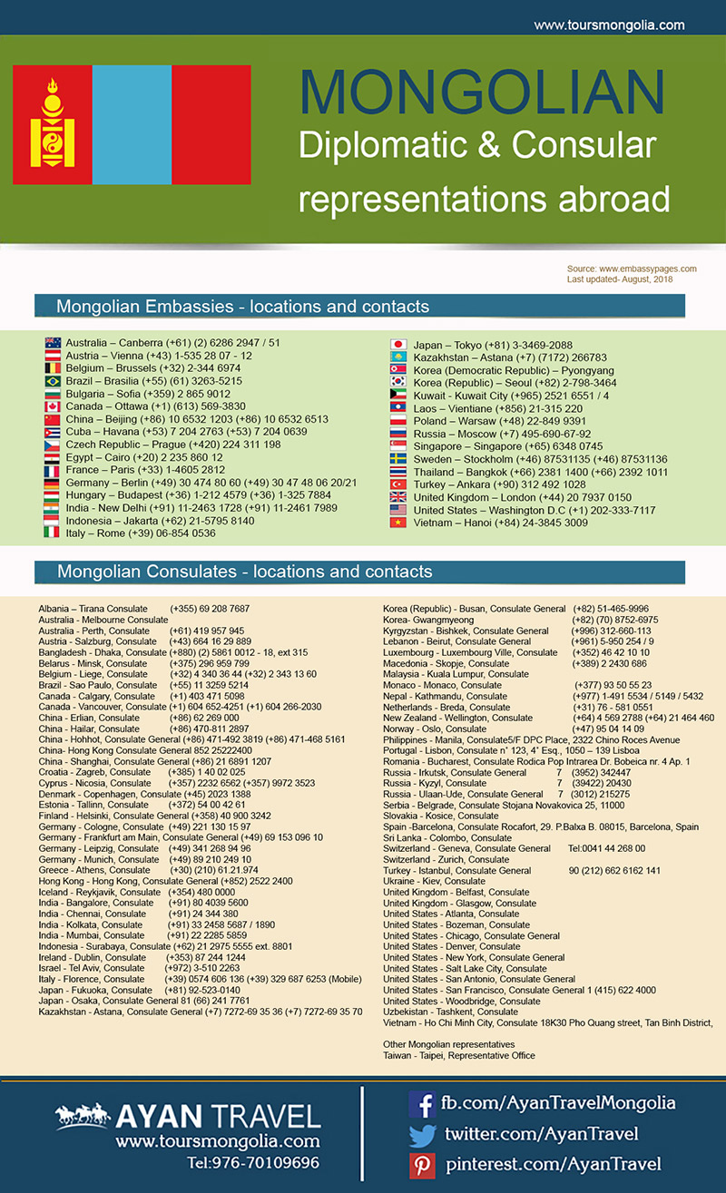 Currently, Mongolia maintains 31 embassies abroad as well as 82 consulates and one other representation.